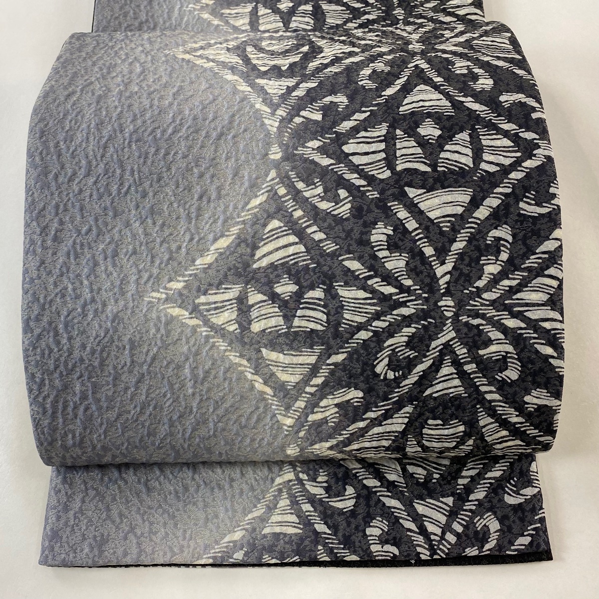 - 袋帯 美品 逸品 手先二通り 花 幾何学模様 銀糸 青灰色 全通 正絹 【中古】