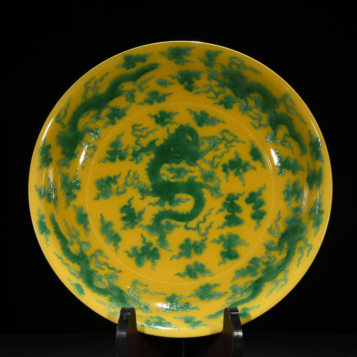 > ◆珍蔵◆中国古美術 大清康熙年製款 黄釉 古陶磁 九龍紋大盤 美品 細密細工造 置物 擺件 古賞物 骨董 時代物 A33