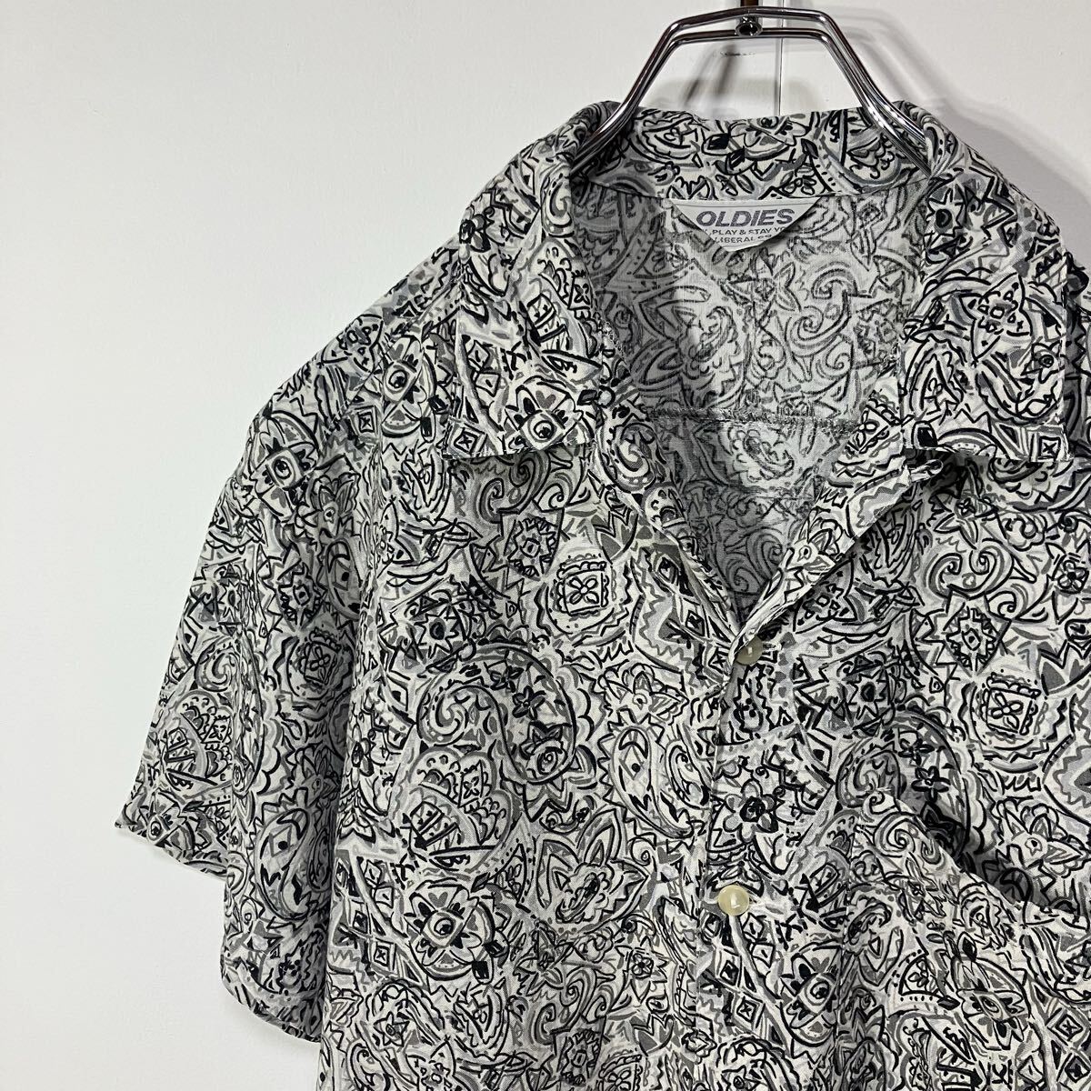 - 古着 ヴィンテージ ペイズリー アート レトロ ポケット 開襟 オープンカラー ラウンドカット レーヨン 麻混 半袖 シャツ ライトグレー M