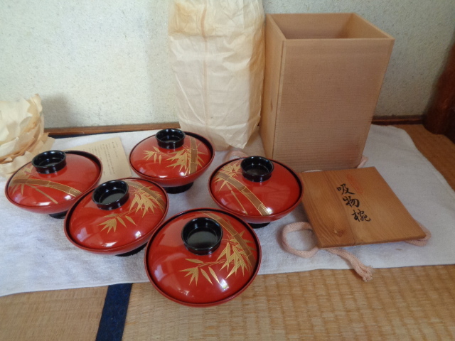 - 越前塗 吸物椀 5個セット/汁椀 5客セット/漆芸・塗り椀/専用共箱付未使用美品-長期保管品