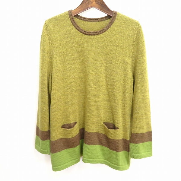 > #w レリアン Leilian ニット セーター 13+ 緑系 茶 配色 長袖 13号 毛 ウール 100% 大きいサイズ 美品 レディース [952785] k01