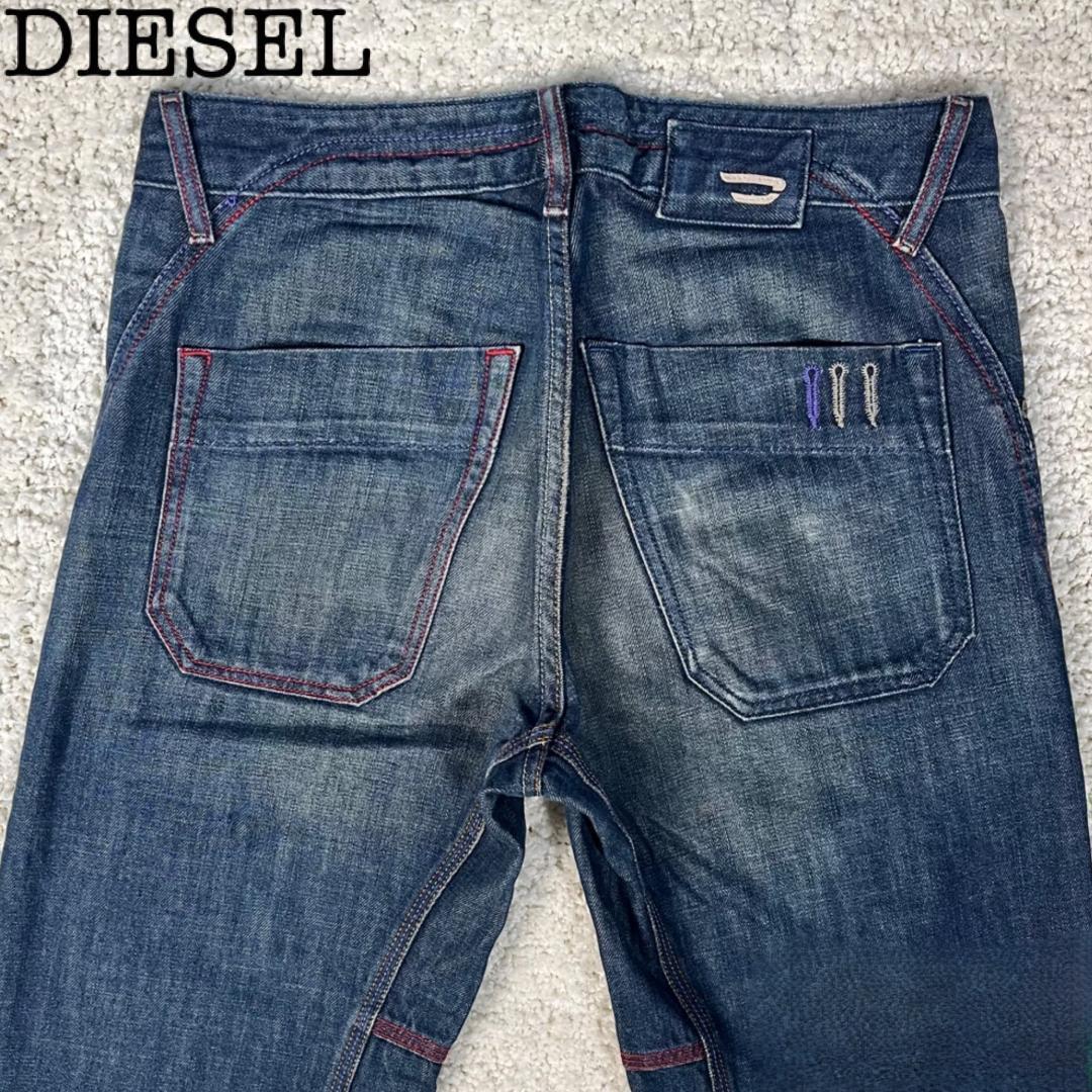 > ディーゼル W28 ワイドパンツ ブーツカット デニム インディゴ ステッチ DIESEL 赤 ジーンズ ジーパン Gパン ストリート