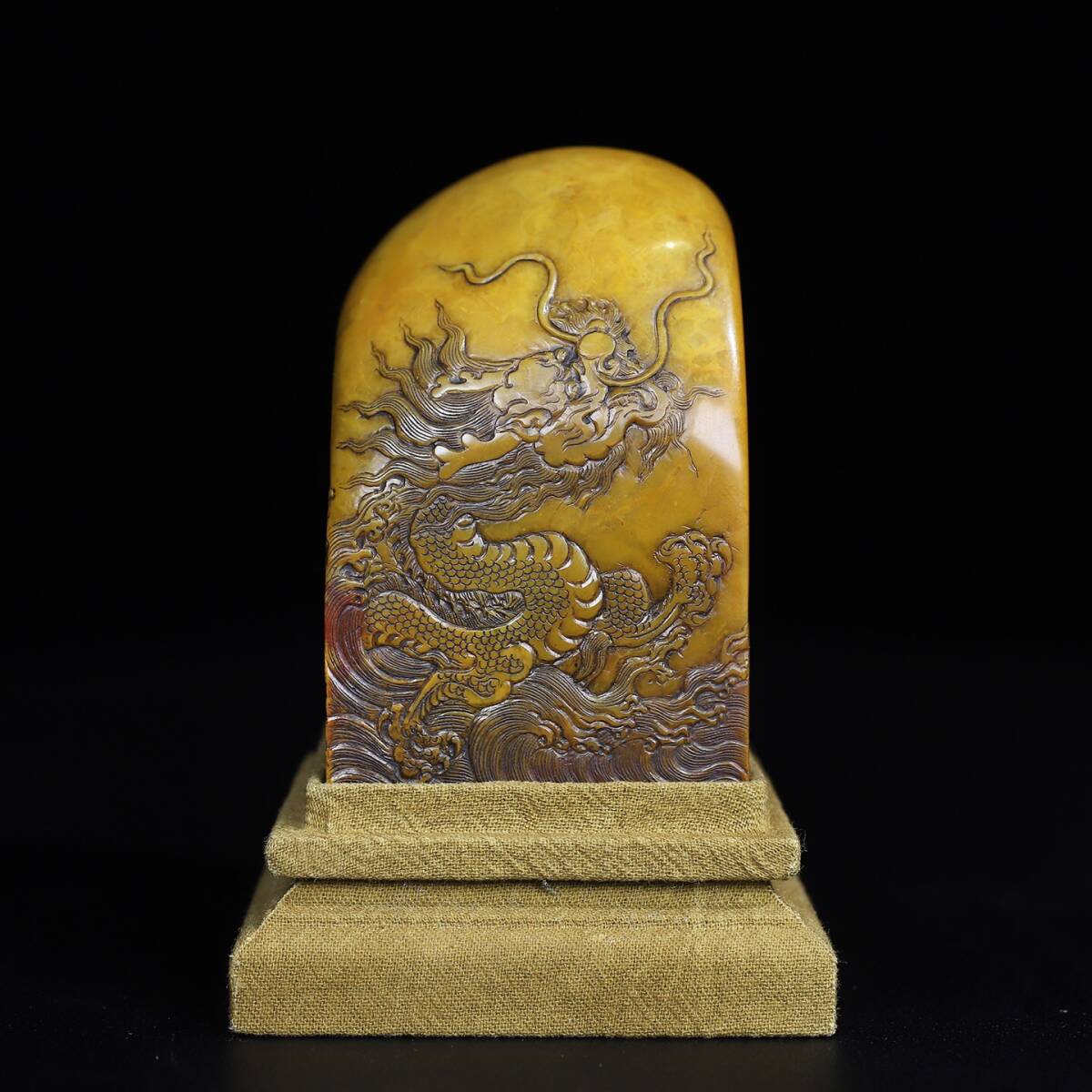> 【超珍館蔵】寿山石 田黄石 細密彫 龍騰四海紋印章 印章 印鑒 文房具 書道品 古賞物 古董品 古美術品 時代物 旧家蔵出 稀少珍蔵品