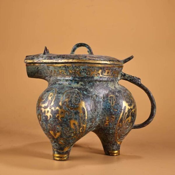 - 【美の継承】『旧蔵・青銅器・措金・三足酒壺・分酒器皿』鍍金・純銅製・青銅製・中国古美術・極細工・古董品・時代物・文房置物 R07080708