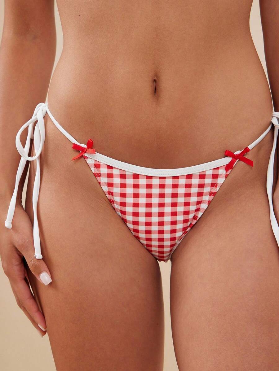 - レディース 水着 ボトムス ギンガムリボントリム ミッドライズ 調整可能サイドタイ ハイカットレッグ セミシーキー ビキニボトム
