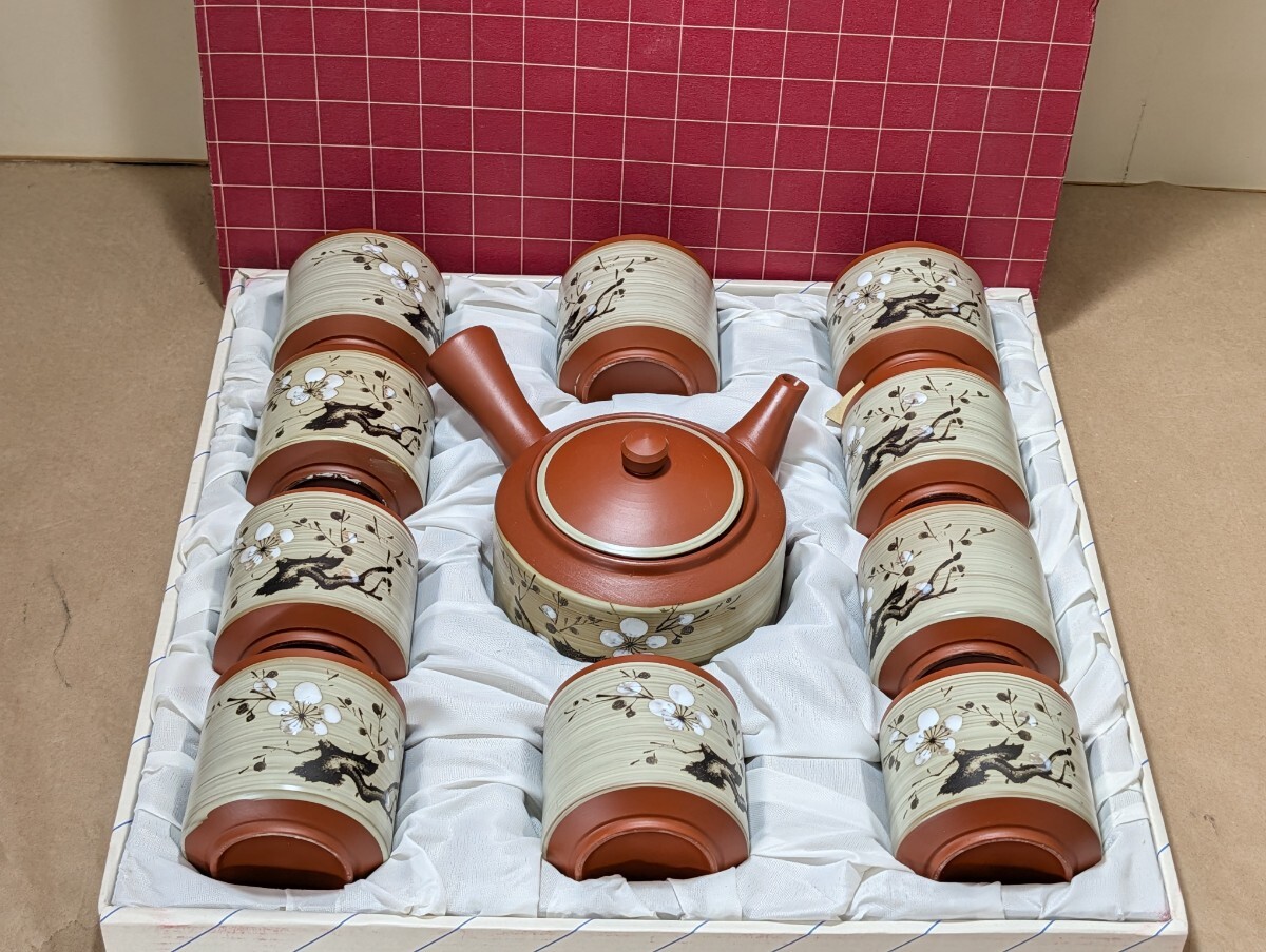 - 朱泥白盛梅 十客 茶器揃 急須1 湯呑10 未使用箱入 〔まとめて取引がお得⇒追加送料無し〕/食器/陶磁器/