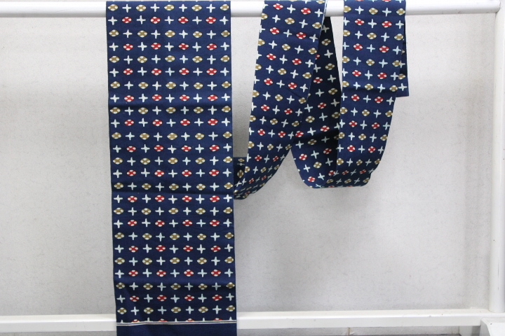 > きもの今昔8972 名古屋帯 八寸名古屋かがり仕立て帯 肉厚の綿素材に染加工 藍色地に丸の面白くかわいい柄