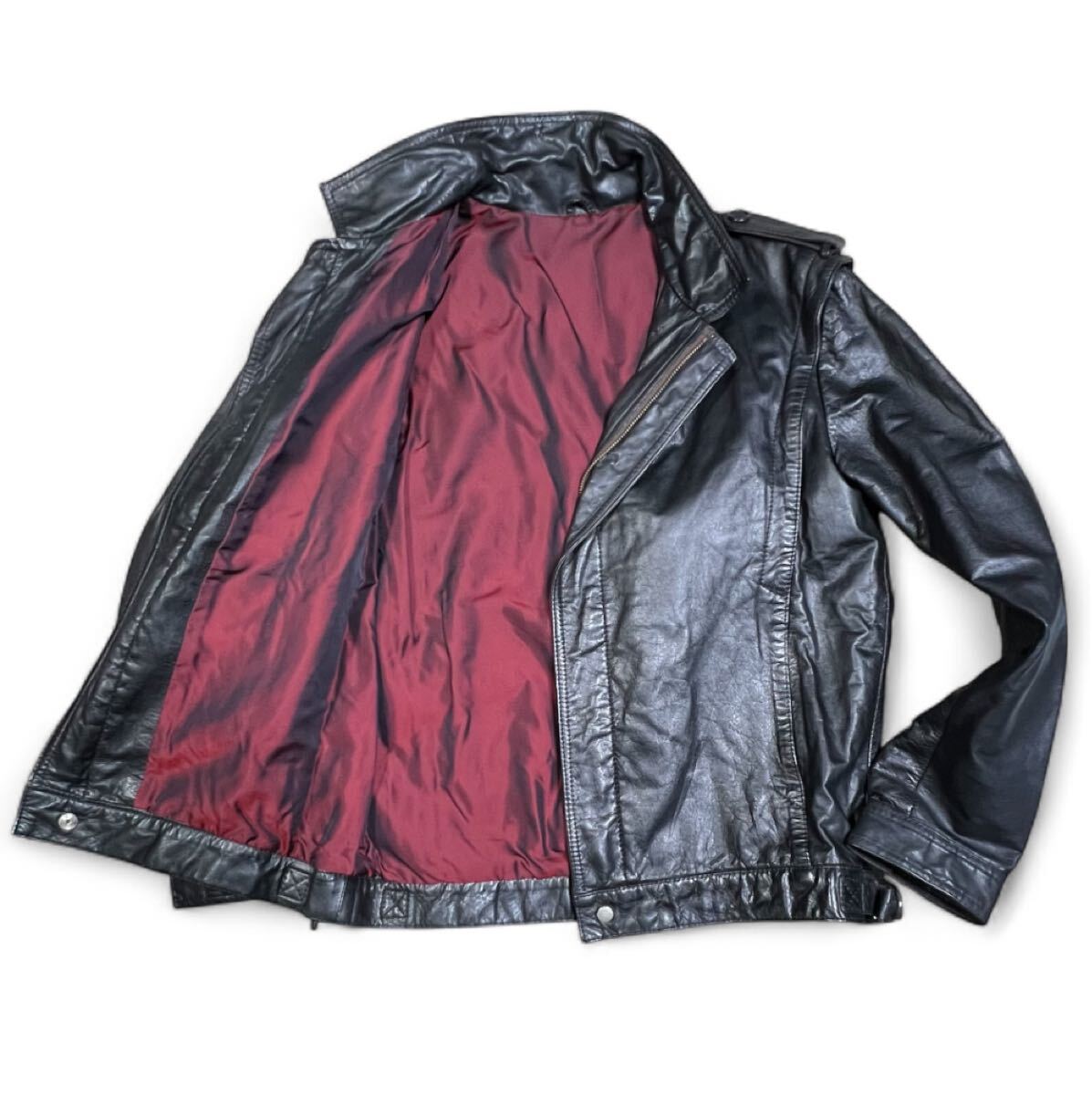 - 美品 リアルレザー 本革 スタンドカラー シングルライダースジャケット 裏地玉虫色 ボルドー M程 エポレット レザージャケット