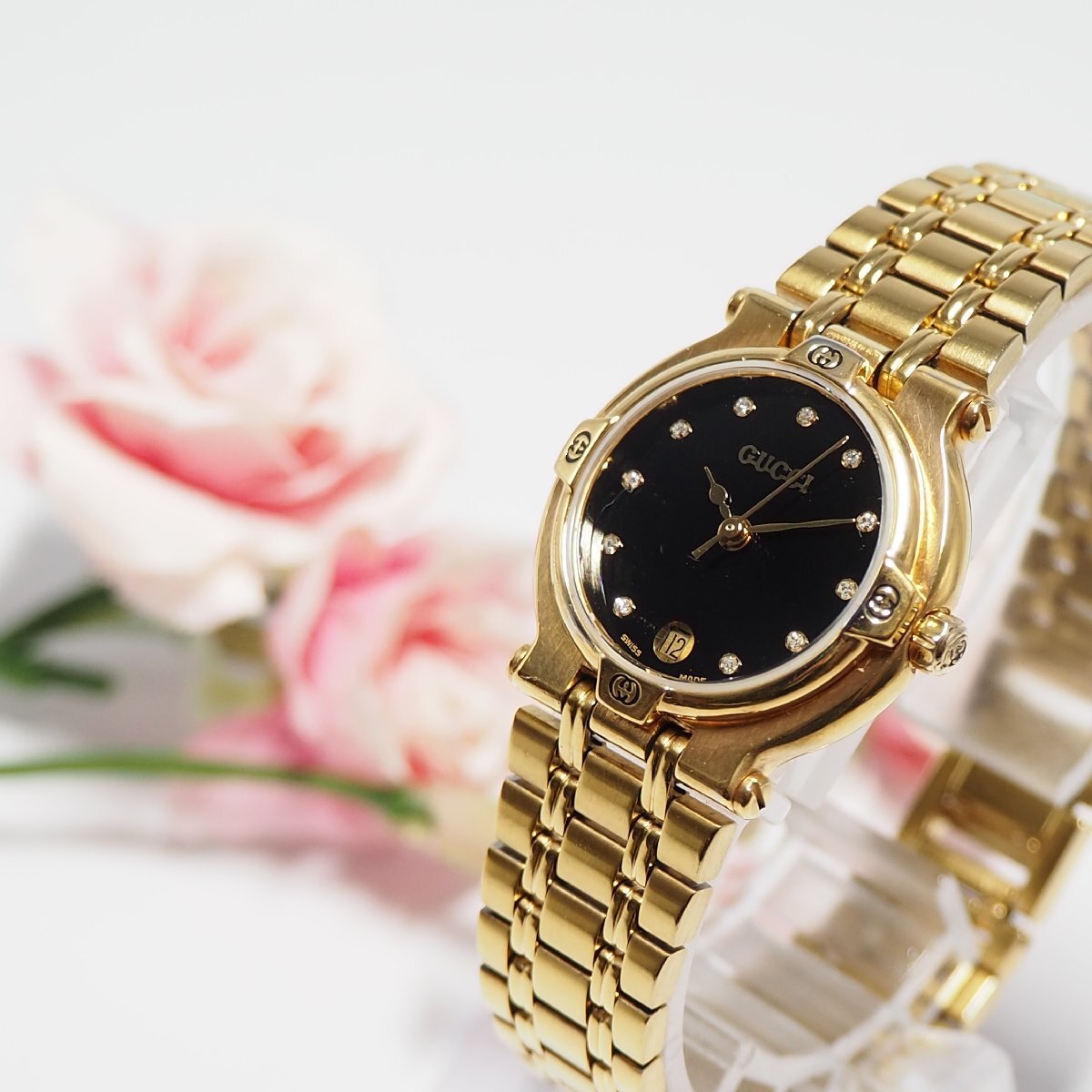 ★★★★ 美品 グッチ GUCCI 9200L 黒文字盤 デイト 11Pダイヤ レディース 腕時計 H270 中古★★★★