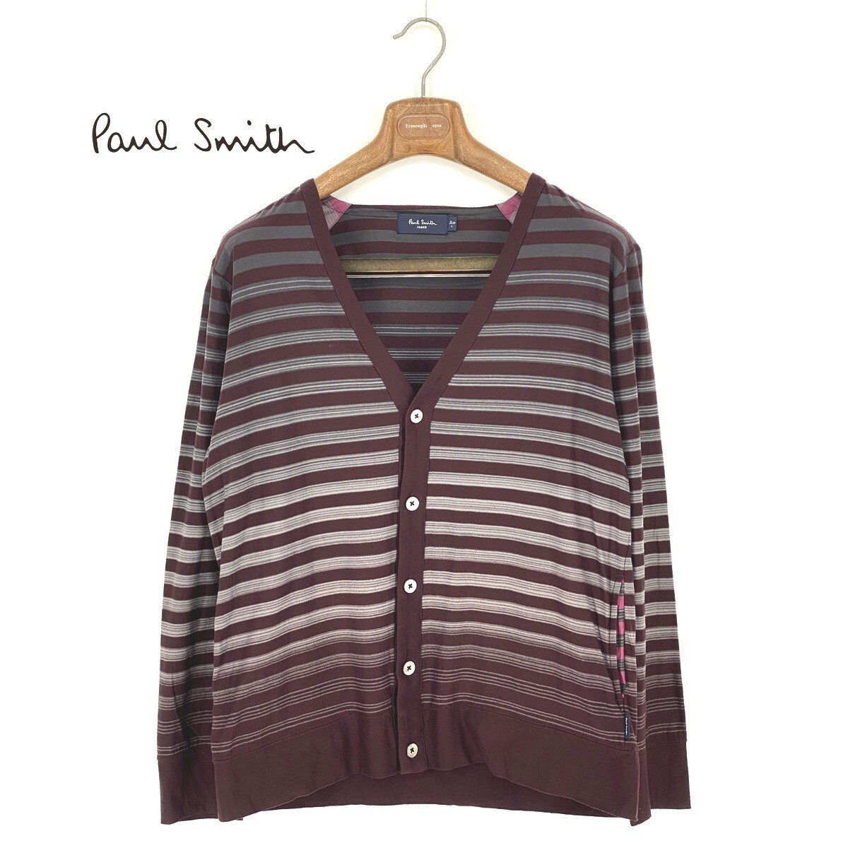 > B0886/美品 Paul Smith ポールスミス コットン ボーダー グラデーション 長袖 Vネック シェルボタン ニット カーディガン L 茶 灰色 メンズ