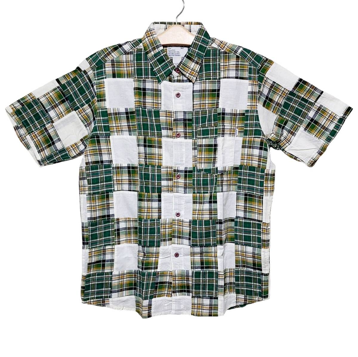 > 希少レア2009年製!新品タグ付き!STUSSY ステューシー/チェック柄パッチワーク半袖シャツ L グリーン×アイボリー 入手困難デッドストック