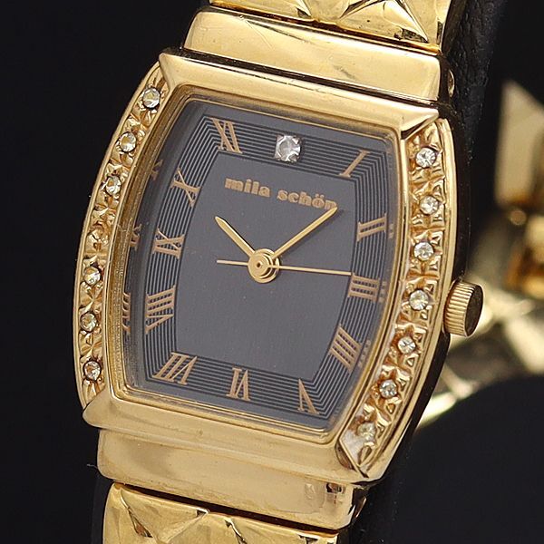 - 良品 ミラショーン QZ 黒文字盤 石付 ローマン レディース腕時計 NKG