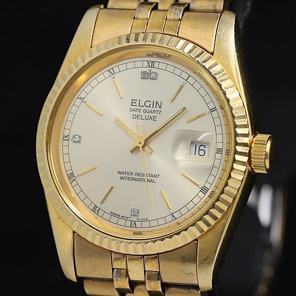 > 稼働 良品 エルジン QZ デラックス FK-343 アイボリー文字盤 デイト ラウンド メンズ腕時計 TCY2000000 NSK