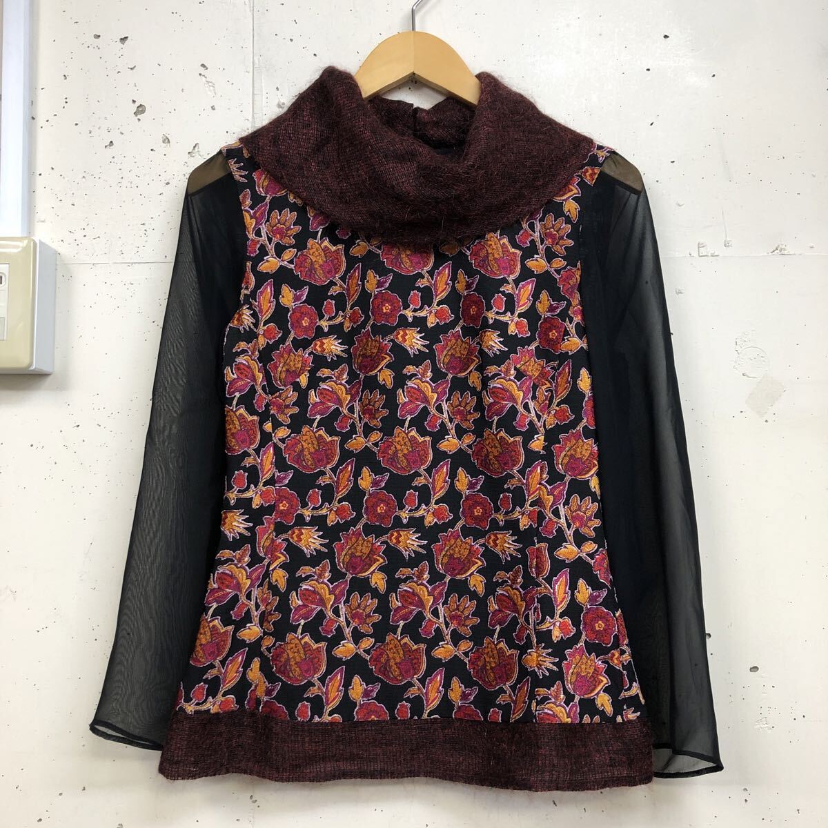 > 美品 KENZO PARIS ケンゾー 異素材切り替え カットソー トップス 長袖 38 花柄 シアー フランス製 レディース 赤系 ウール混