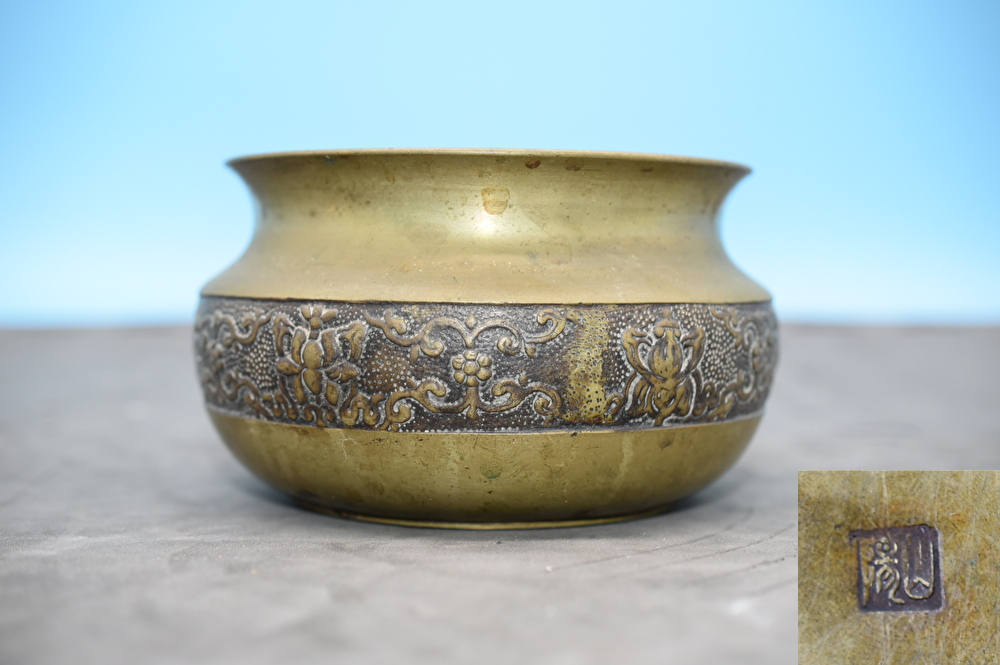 - WY9-22 山陽造 花文 唐草文様 建水 黄銅製 煎茶道具 茶道具 金工 金属工芸 工芸品 長期保管 現状品