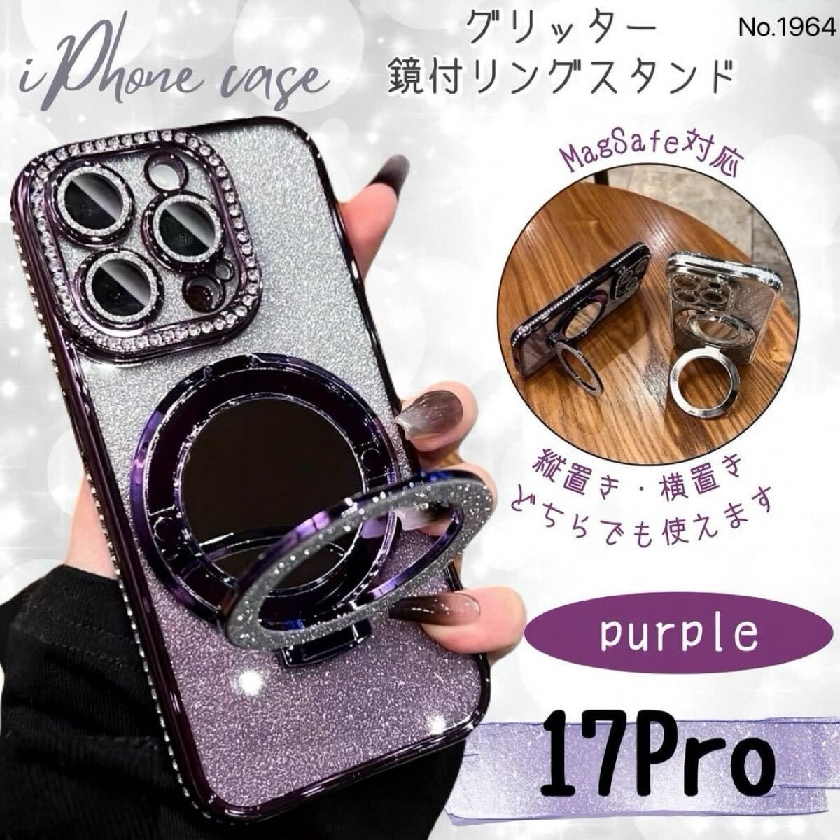- 新品!グリッター 鏡付 リングスタンド iPhone17Proケース パープル ラメ