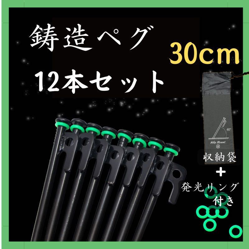 - 鋳造ペグ 30cm 12本 収納袋 蓄光リング付 スチール テント タープ ペグ キャンプ
