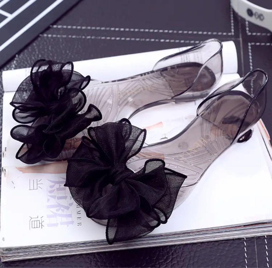 - ラバーサンダル 38 リボン 花 コサージュ フラワー モチーフ フラット