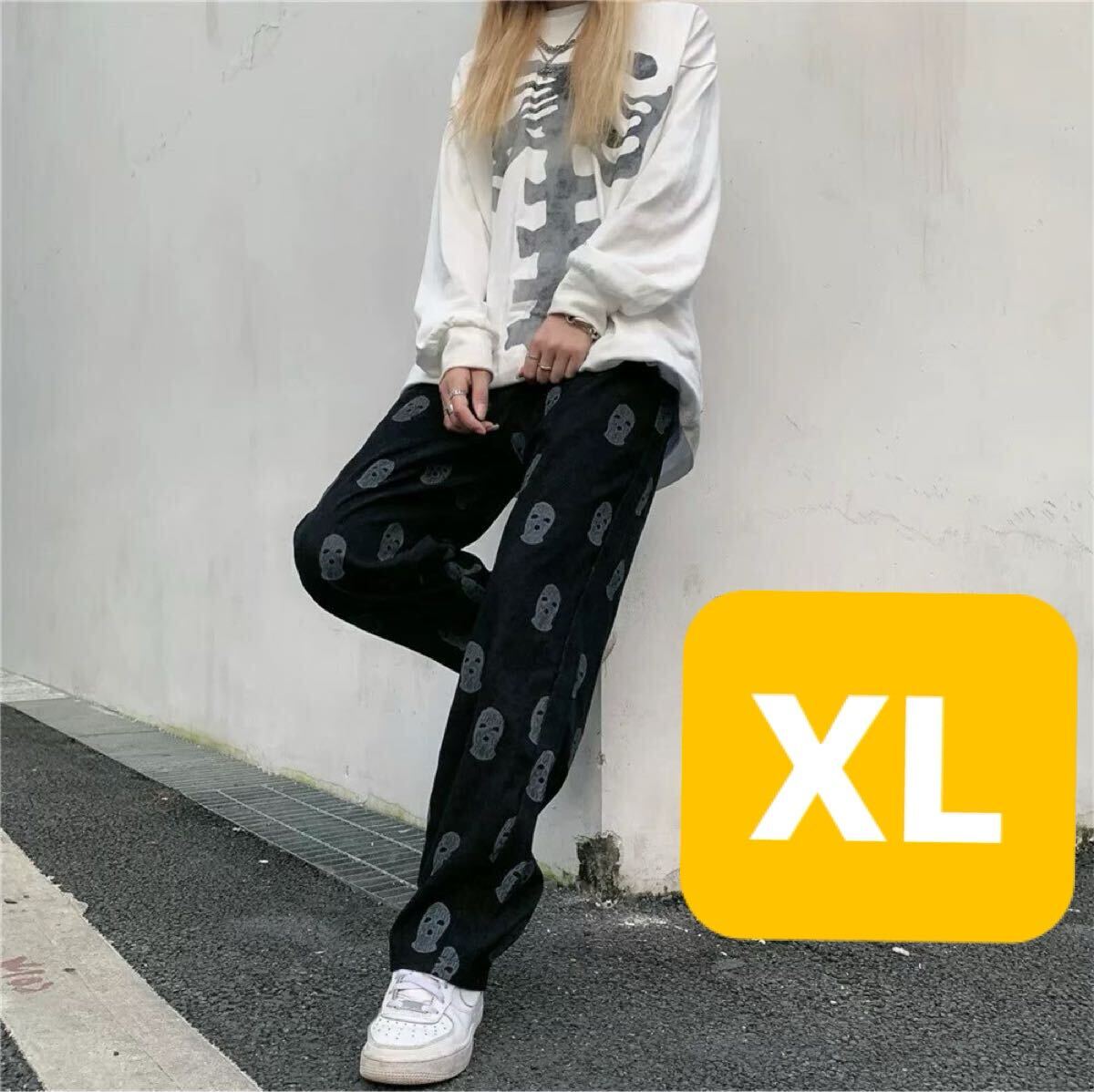 - ワイドパンツ ボトムス ストレートパンツ ドクロ柄 パンツ メンズ レディース ワイドレッグパンツ #黒 #くろ #XL #ブラック