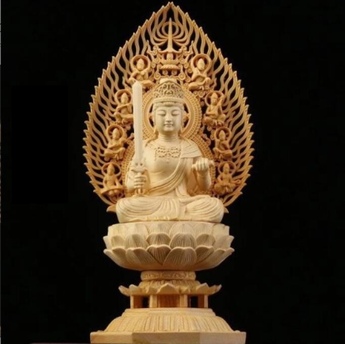 - 新入荷上質 文殊菩薩 木製 守り本尊 仏 像 飛天光背 仏教美術品 約29cm