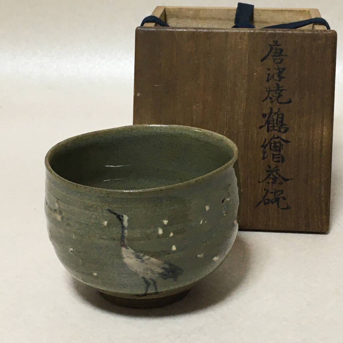 - E631 唐津焼 鶴絵 青磁 茶碗 湯呑 共箱 煎茶道具