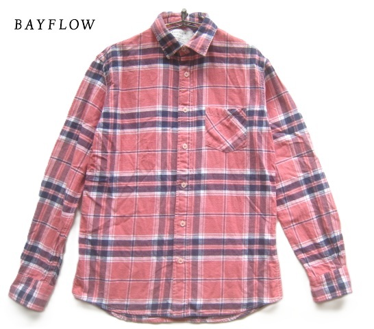 > 美品!!ベイフロー BAYFLOW*胸ポケット付き チェック柄 コットンフランネルシャツ 3 実寸M ピンク×紺×白 SURF サーフ 海上がりに着たい