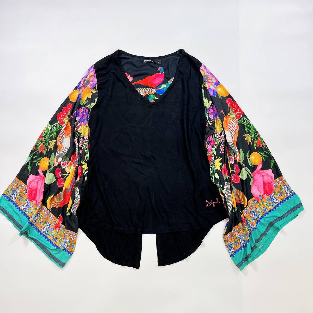 - Desigual フレア袖 長袖 カットソー ストレッチ 黒 S 袖総柄 華やか Vネック 後ろスリット 刺繍ロゴ 鳥柄 フルーツ柄 秋 デシグアル〇506y