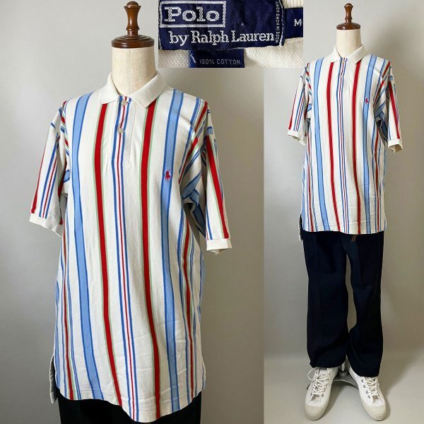 > ★【名作 縦ストライプライン ナイガイ社製 】90s POLO by RALPH LAUREN ポロ ラルフローレン コットン100% ストライプ ポロシャツ M USED