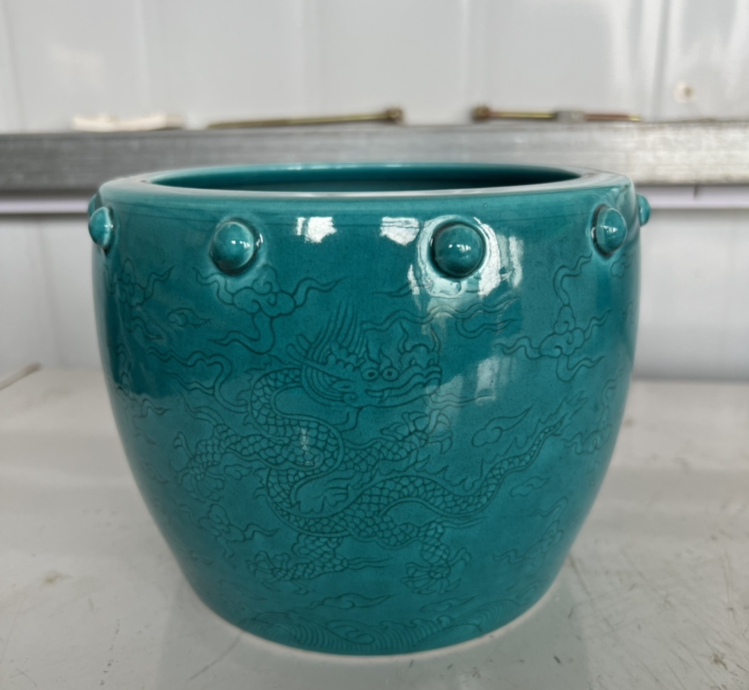 - 9+GV9196「東洋美術」 中国骨董 人間国宝 磁器製品【孔雀青釉彫龍文鼓釘洗面器】 旧物 孤品 珍品 陶磁器 収蔵価値が高い