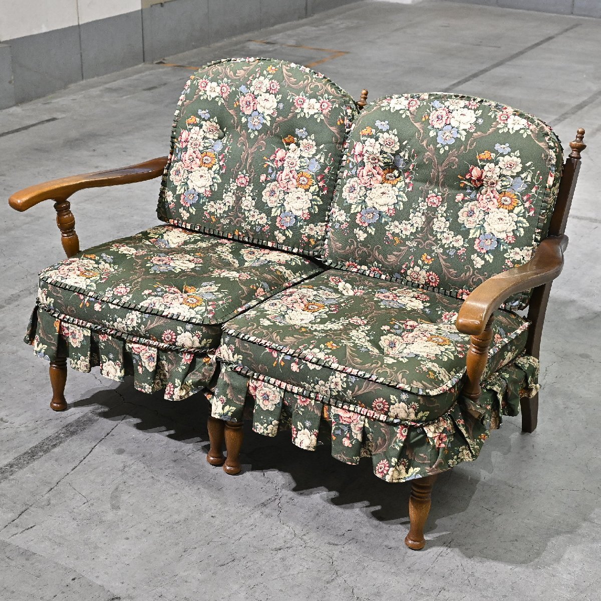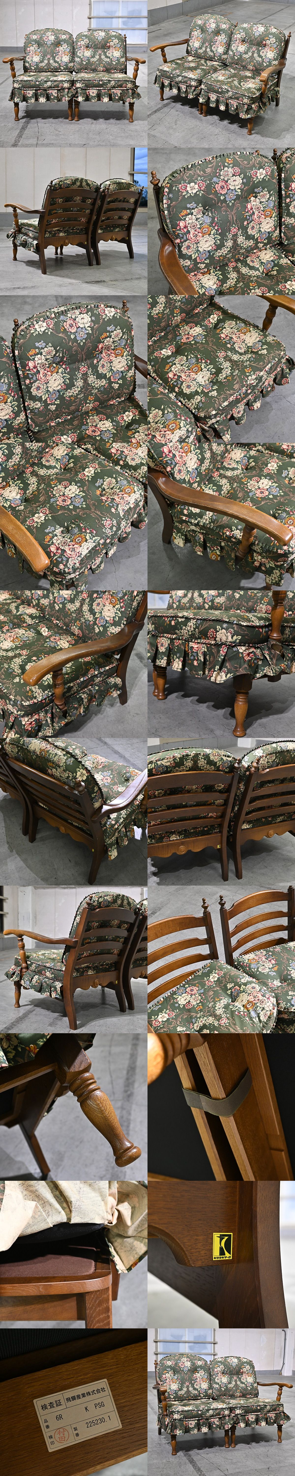 - 飛騨産業 24万「穂高」2人掛けソファ オーク無垢材 リビング ラブ セパレート アンティーク調 花柄 キツツキ 応接間_マルニ カリモク