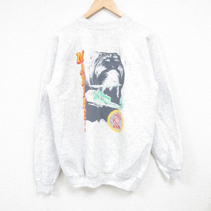 > L/古着 ヘインズ Hanes 長袖 スウェット メンズ 90s ミリタリー USMC アメリカ海兵隊 ラグラン クルーネック 薄グレー 霜降