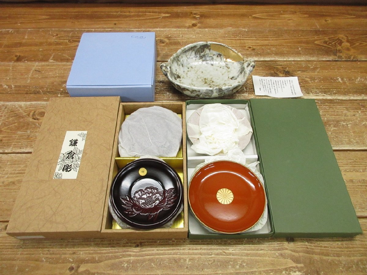 > 【WD-8522】未使用 鎌倉彫 牡丹 茶托 雅鳳窯 鉢 菊紋 朱色 皿 和食器セット まとめ 東京引取可【千円市場】