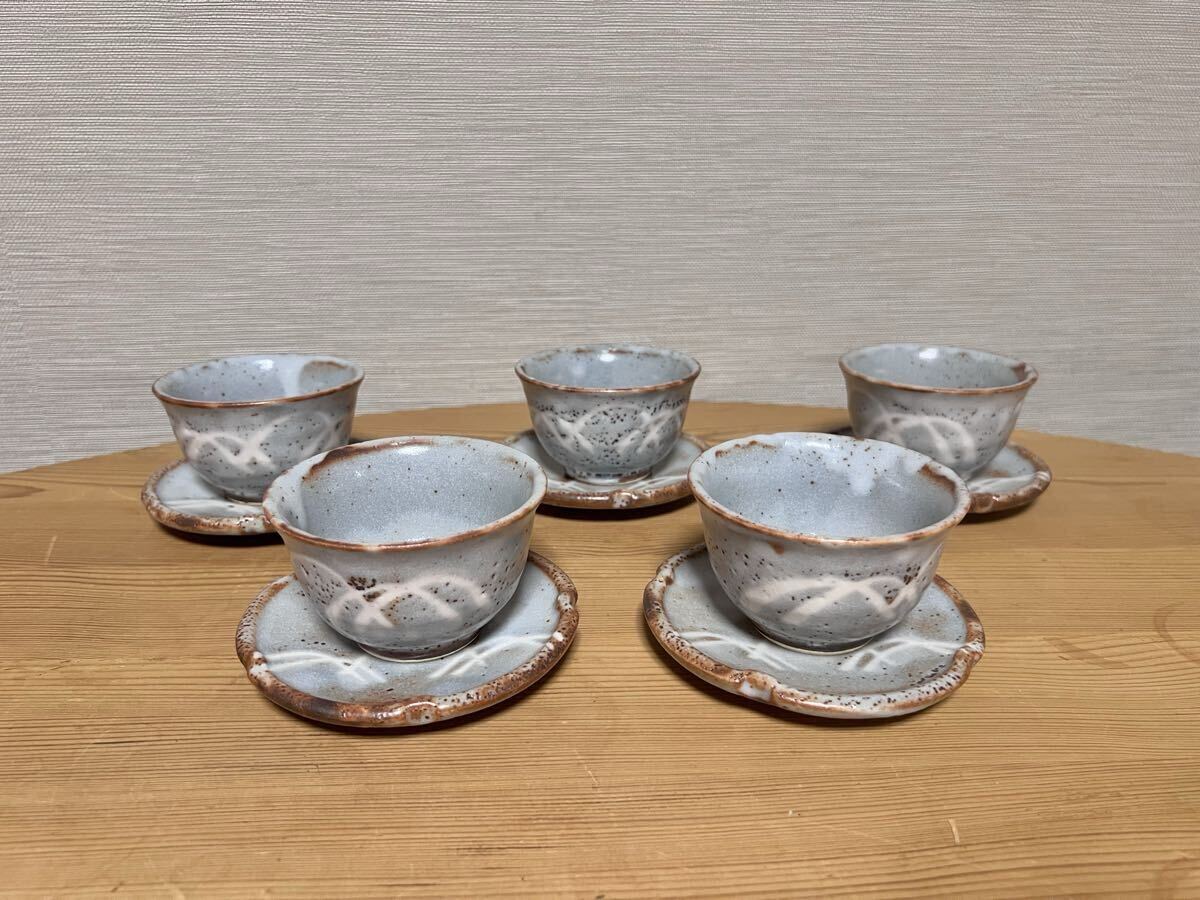- 【 美濃焼 鼠志野焼湯呑セット】絵志野湯呑5客 絵志野銘々皿5客 汲み出し茶碗 絵志野茶托 カップ&ソーサー 茶器 茶碗 茶托 茶道具