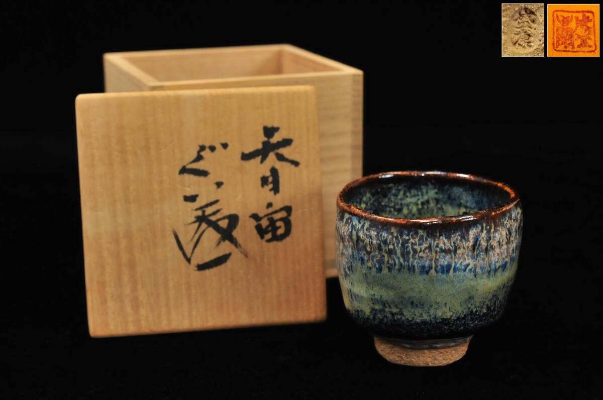 > 【真作】 木村盛康 天目宙 ぐい呑 高さ:約6cm 直径:約6.5cm 重量:98g 共布共箱 酒器 03408040-2