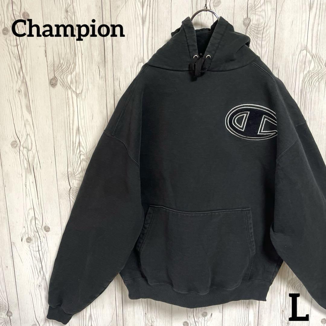 - Champion チャンピオン フーデイスウェットパーカー メンズLサイズ ブラック 黒 フード付 トレーナー ワンポイント 古着
