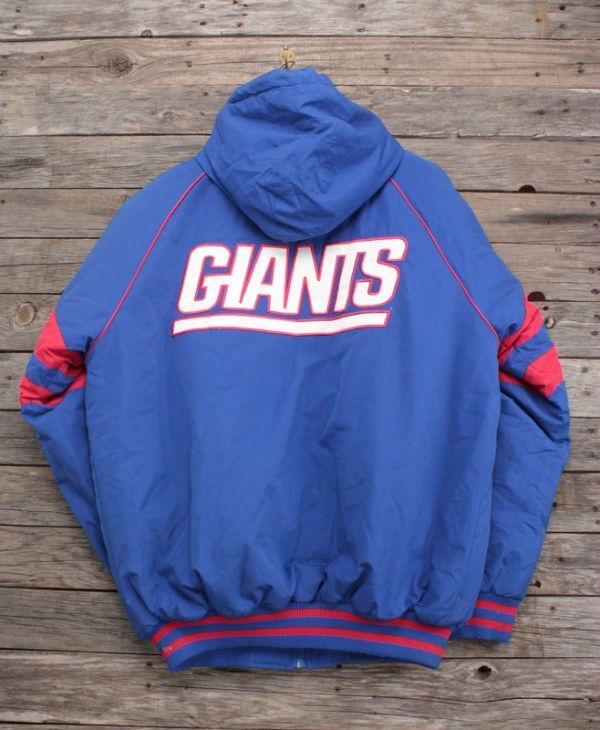 - ⅢGアパレル NFL NY ジャイアンツ 中綿入り フード付き ナイロンスタジャン 青 表M