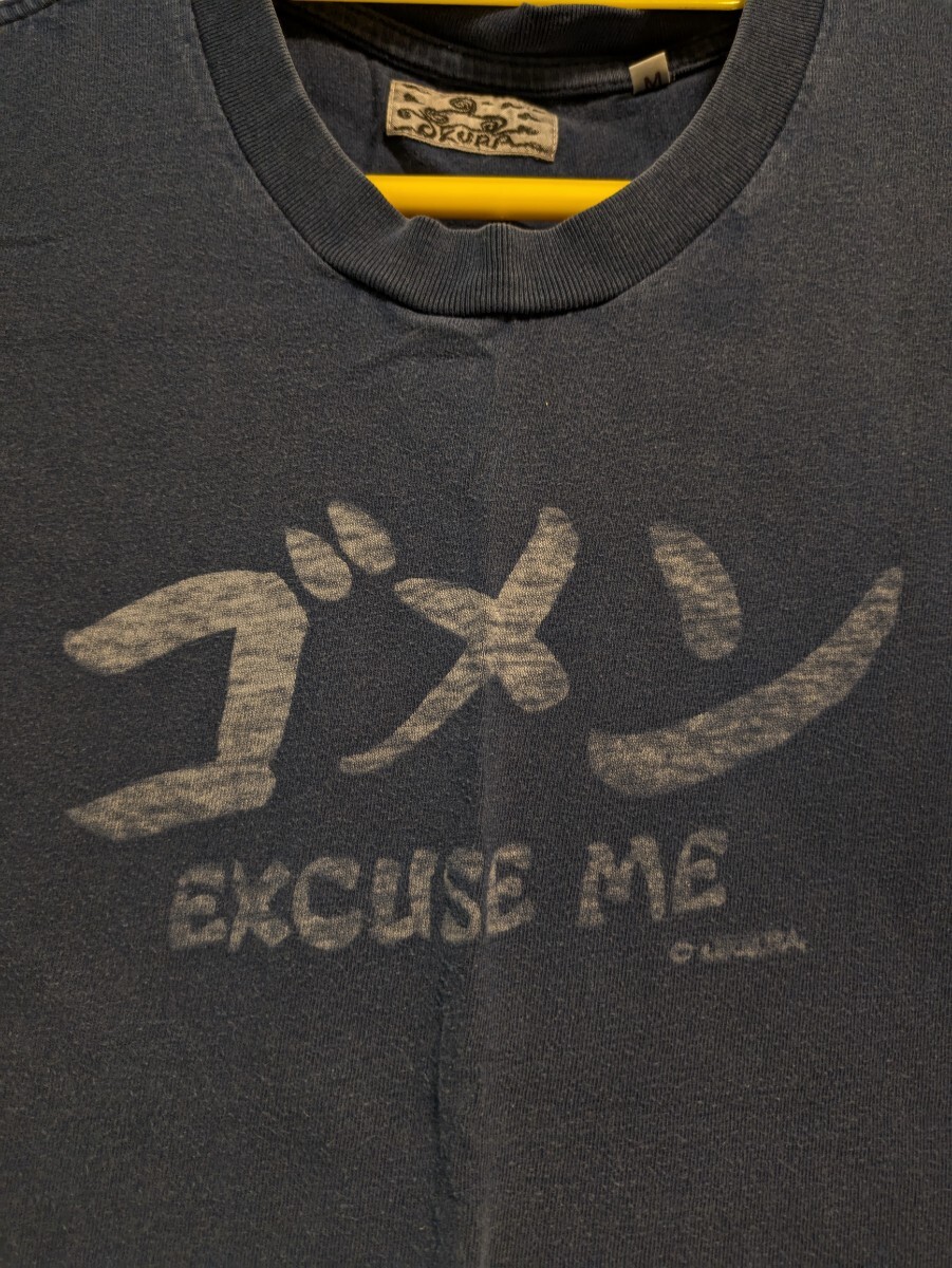 > OKURA オクラ ゴメン Tシャツ インディゴ Mサイズ ハリウッドランチマーケット 丈66 身幅48 ヴィンテージ Excuse me デニム 色落ち