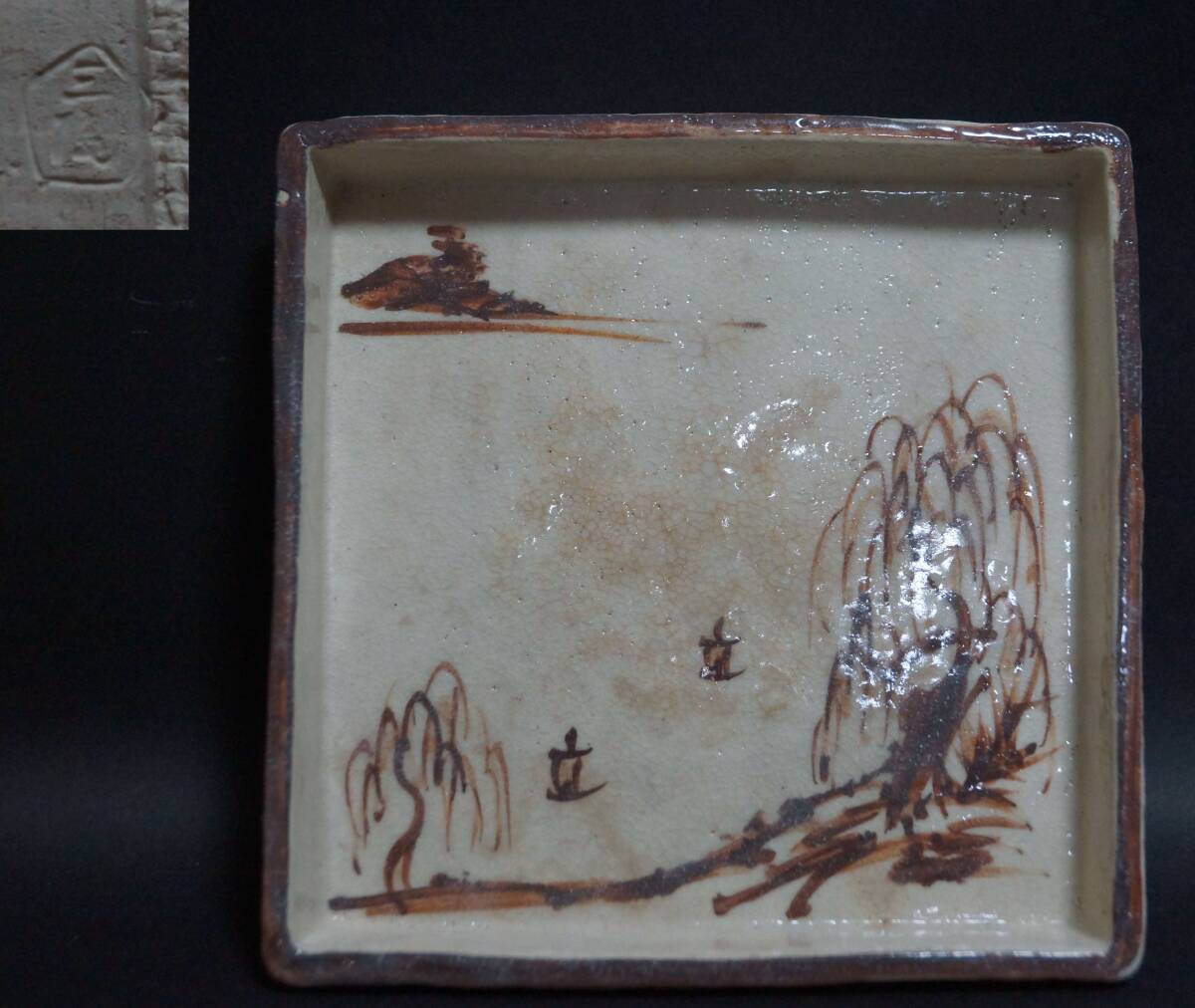 > 【芸】三陶造 色絵『山水風景文』皿 正方皿 角皿 懐石道具 菓子器 菓子皿 茶道具 s70919