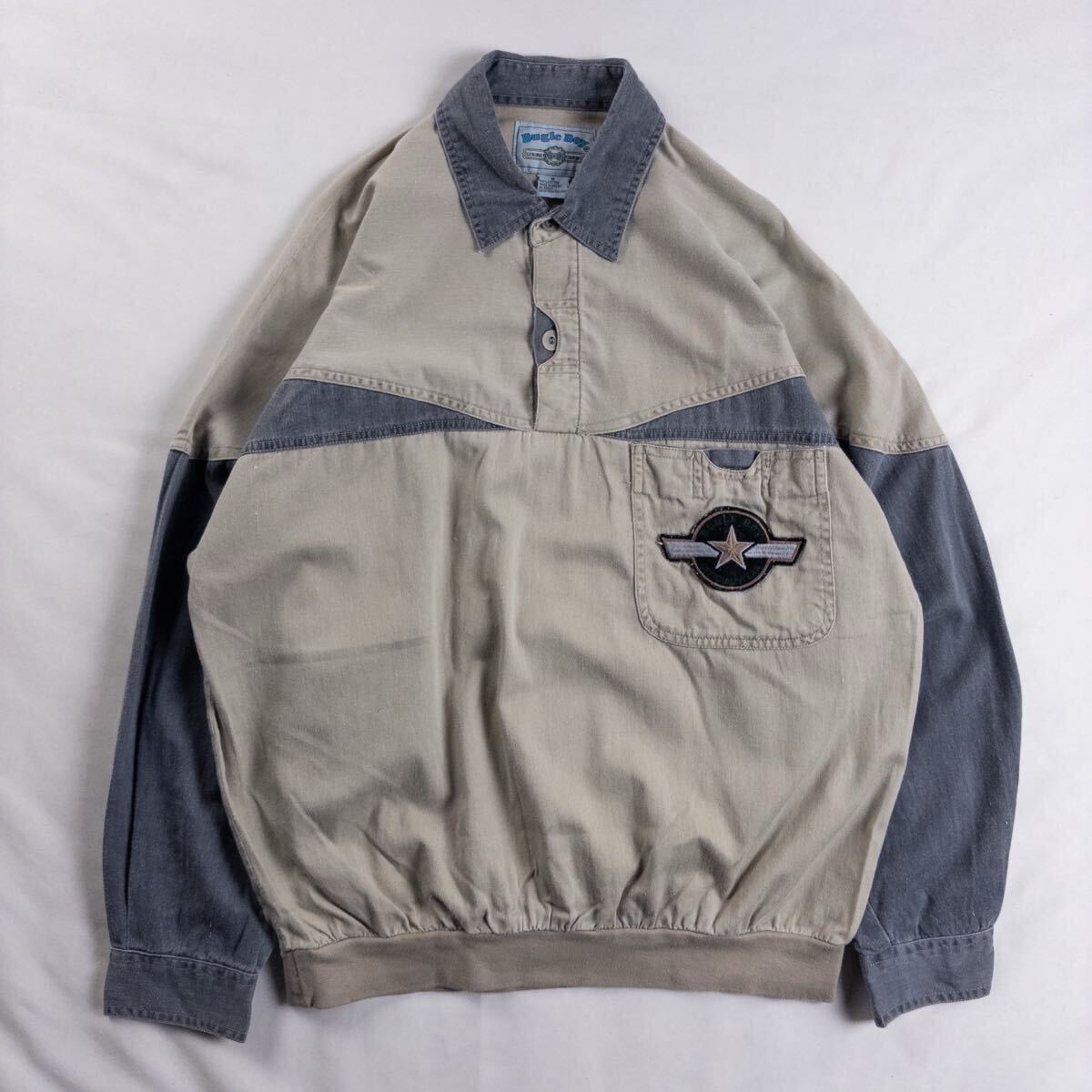 - US Vintage 90s Bugle Boy コットン ツイル ハーフボタン ワッペン 立体 カスリ フェード バイカラー ワーク リブ プルオーバー シャツ