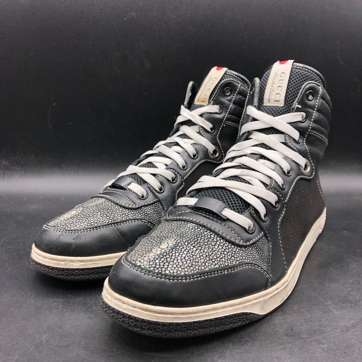 - 9M4652 GUCCI グッチ エイ革 レザー ハイカット スニーカー メンズ 9.5/28.0cm相当 ブラック 黒 シューズ 靴