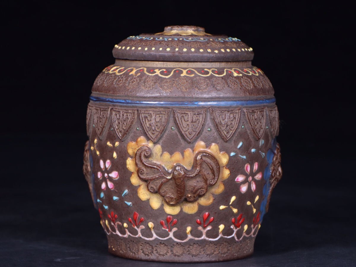 - 「紫砂彫 堆塑施釉加彩 茶葉罐 清時代」陶磁器 置物 擺件 古賞物 中国古美術 蔵出