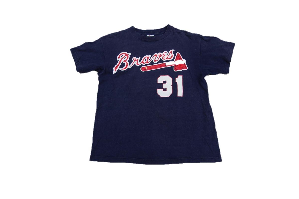 > 80s 90s Majestic S/S Print Tee Atlanta Braves MLB 半袖プリントTシャツ アトランタブレーブス Navy 紺 L Boys ベースボール フェード