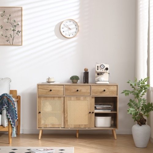 - キャビネット サイドボード チェストラタン調 ラタン風 引き出し付き 大容量 収納棚 リビング 収納 ローボード おしゃれ【ナチュラル】
