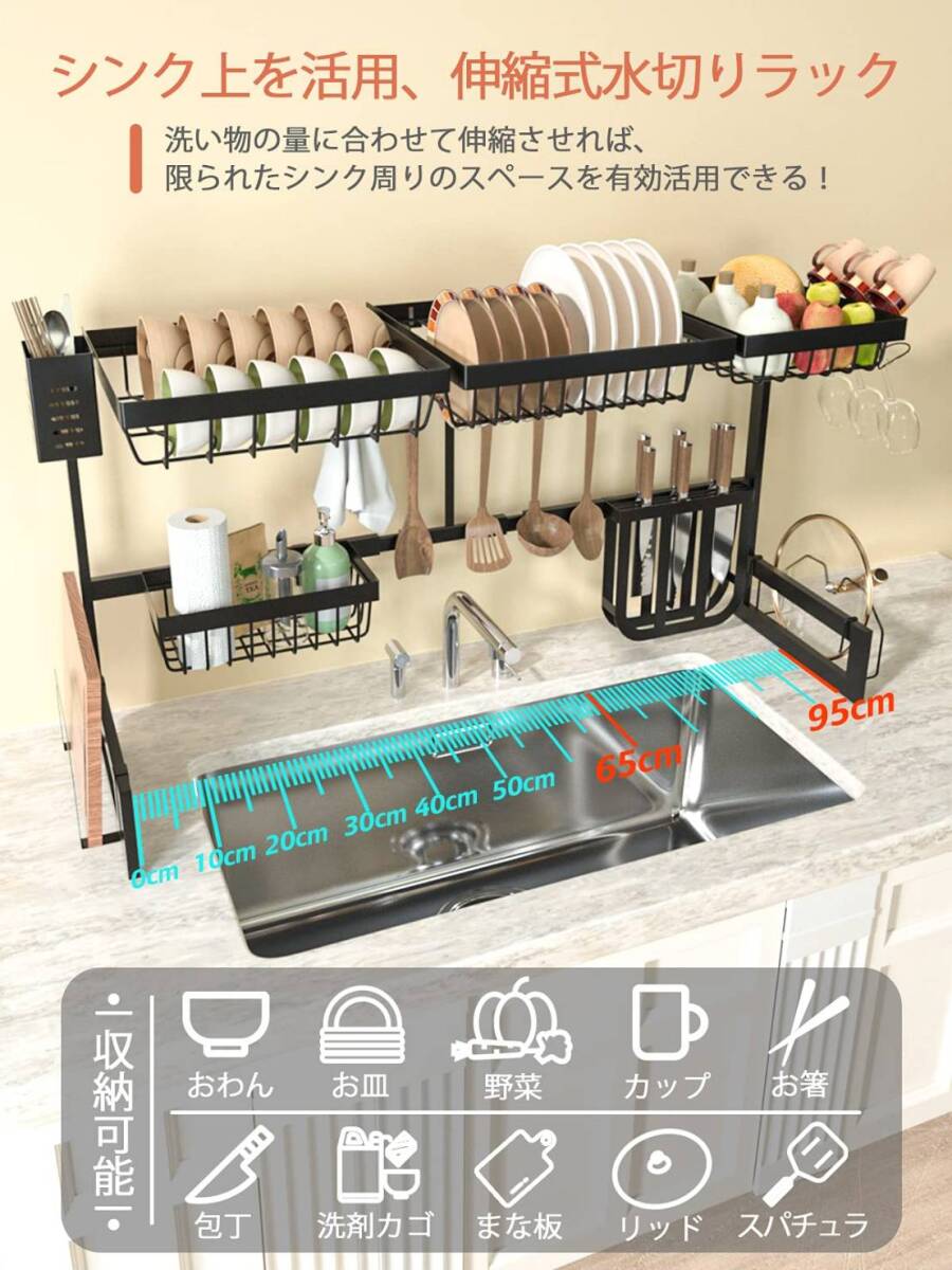 - ステンレス製の伸縮タイプシンク上水切りラック