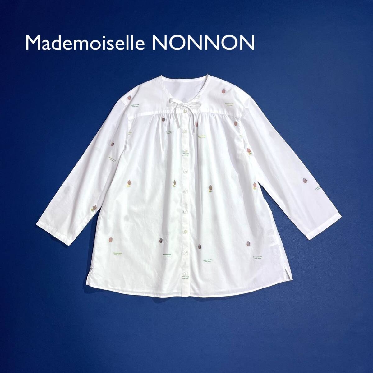 - ci65 Mademoiselle NONNON ボウタイリボン七分袖シャツ 総柄 刺繍 お花 たんぽぽ バスケット かご 定価33,000円