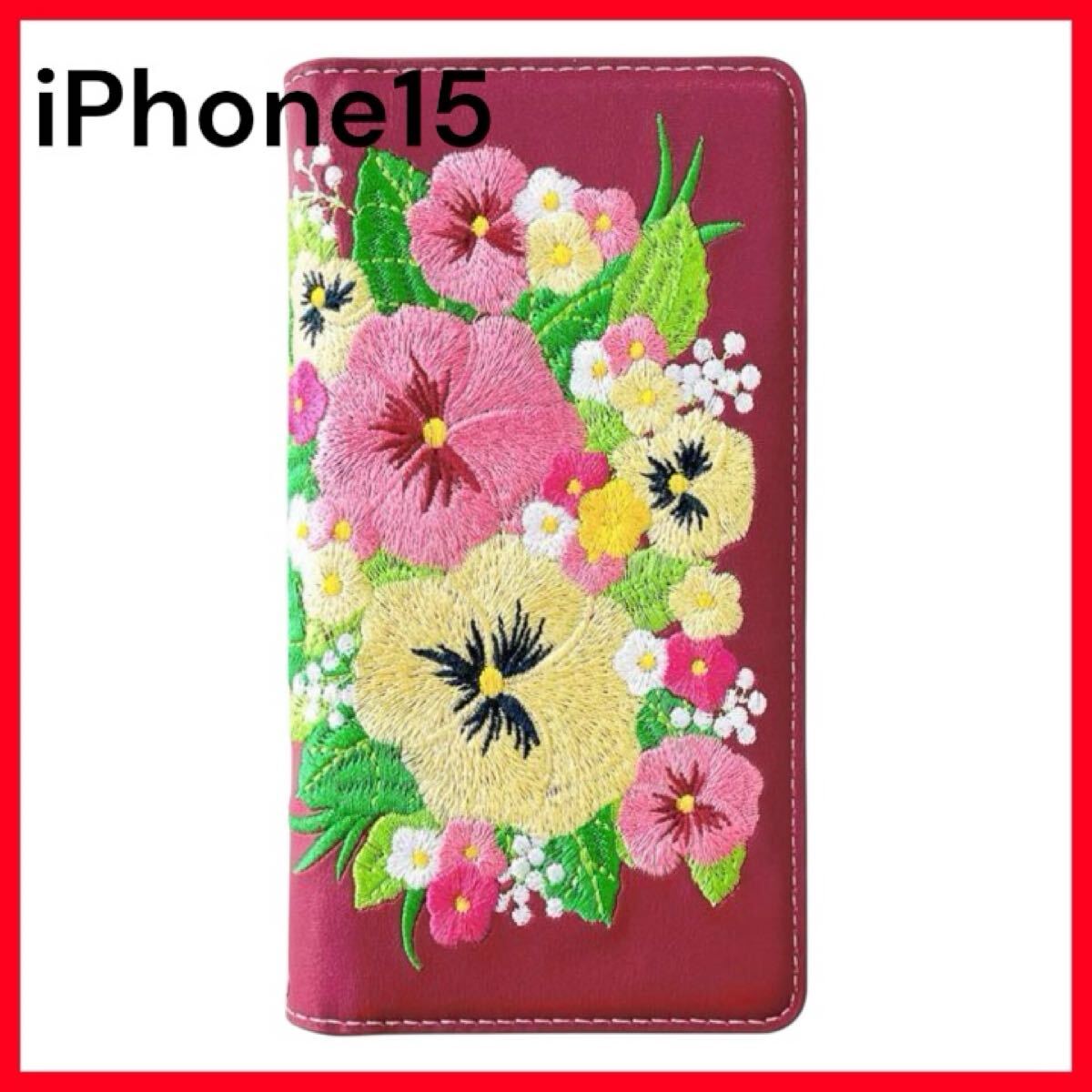 - iPhone 15 専用 手帳型カバー パンジー刺繍 ワインレッド スマホケース