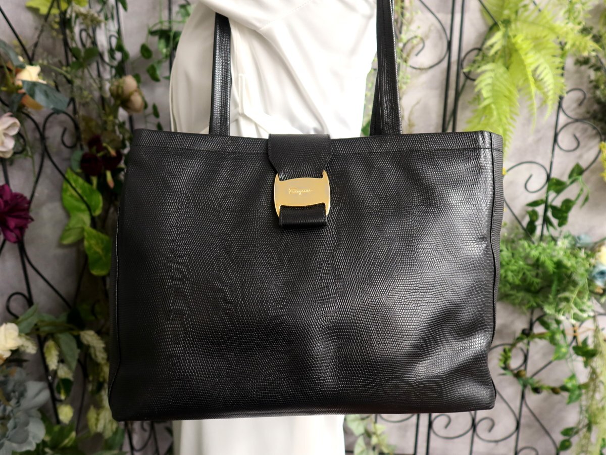 > ●超美品●フェラガモ●ヴァラ●リザード 型押し レザー 本革●ショルダー バッグ●黒●G金具●肩掛け●ヴィンテージ●A4 かばん●Js60499