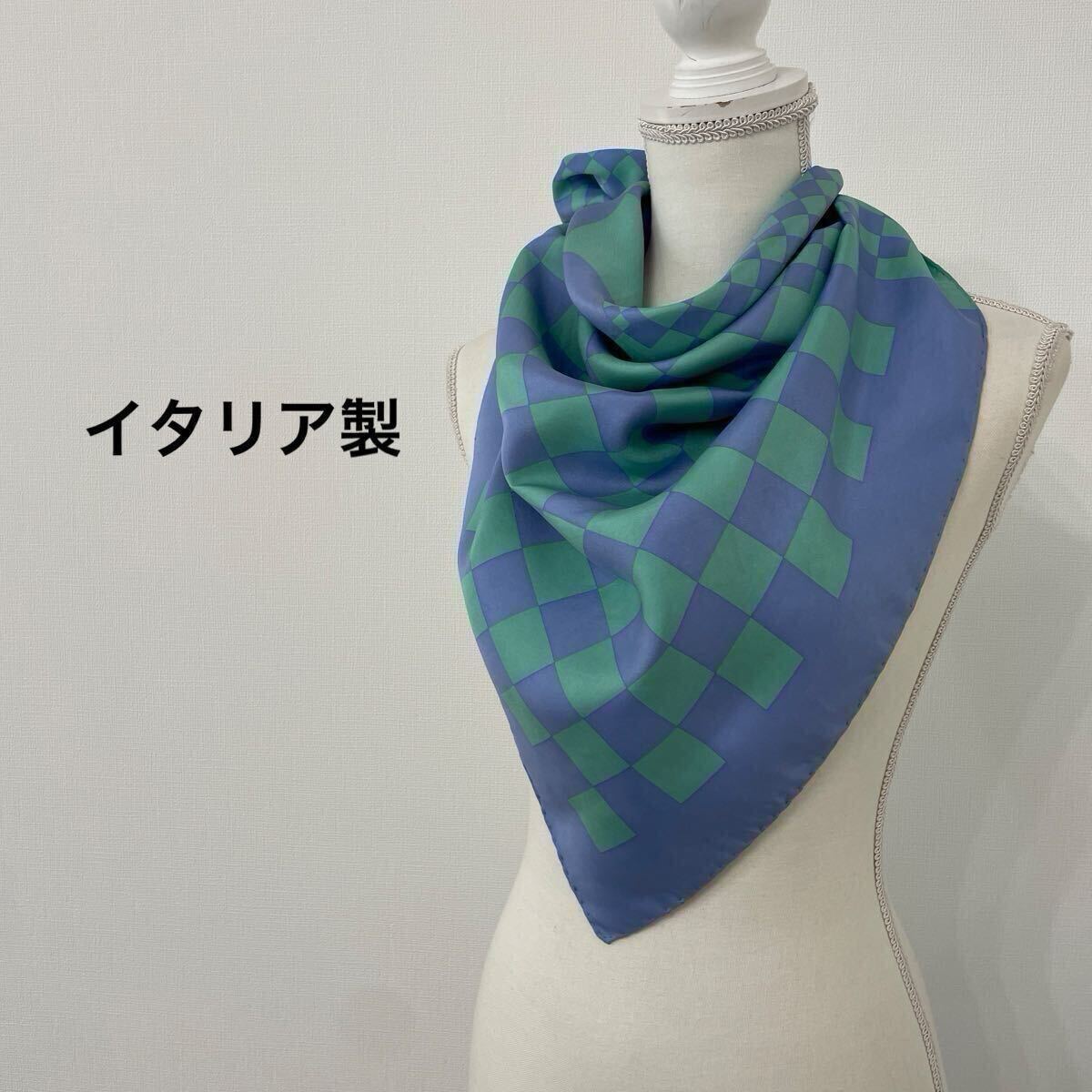 > 【735】Leiliam レリアン スカーフ ストール ショール イタリア製 総柄市松模様 チェック柄 手縫い グリーン ブルー 正方形 ハンドロール
