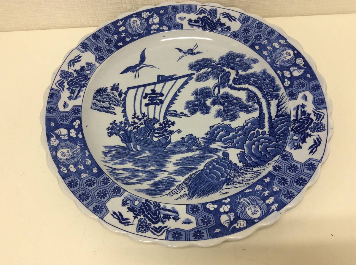 - ■3827 萬古焼 萬古焼大皿 宝船丸皿 大皿 パーティー皿 丸皿 染付 食器 和食器 大皿 宝船 亀 鶴図 アンティーク 中古 保管品