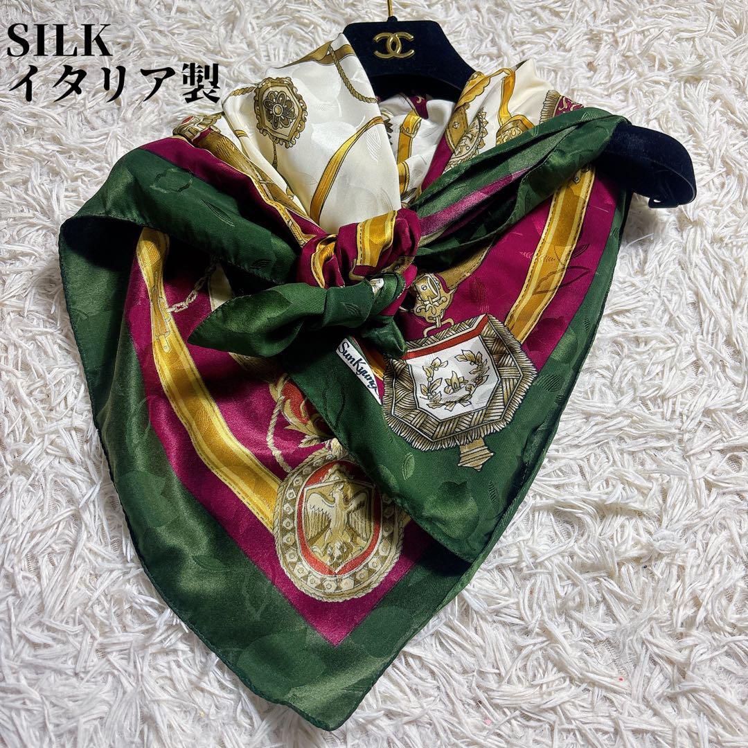 > シルク100%ジャガード織スカーフ イタリア製バンダナ ショール 大判 上品 高級感 総柄 マルチカラー ヴィンテージ 美品